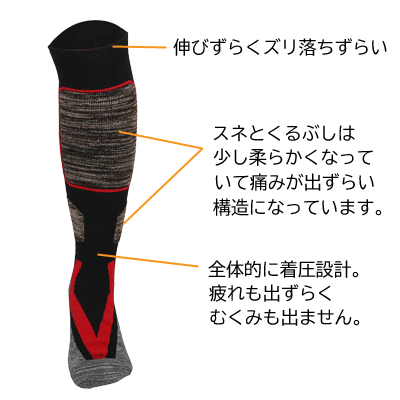 スノーボード・スキーはもちろん、アウトドア、ゴルフなど様々なシーンで使える着圧設計の靴下。