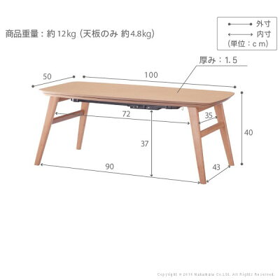 【バリエーション】ブラウン・ナチュラル【仕様】天板:繊維板(転写プリント)脚部:天然木(ラバーウッド)フラットヒーター(130W・中間スイッチ式)コード長さ:約2.8m◎一部組立(脚部取付)【サイズ】幅100x奥行50x高さ40cm重量:約12kg天板サイズ:幅100x奥行50cm・厚み15mm・約4.8kg脚間:(上)72/35cm(下)90/43cm中天板下高さ:37cm株式会社ナカムラ(G0100256)