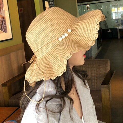 話題の注目アイテム ビーチハット 女性 日焼け防止 麦わら帽子 折りたたみ可能 真珠 帽子[K](T)