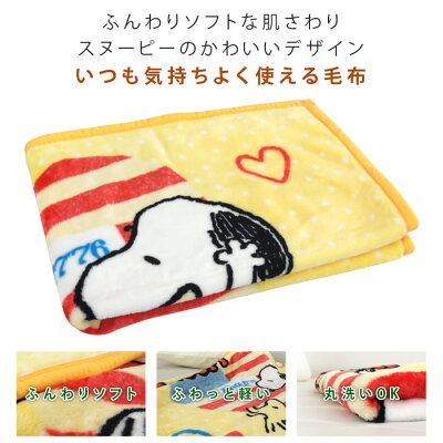 スヌーピー ひざ掛け毛布の紹介 スヌーピーのかわいいデザイン、ふんわり軽くてやわらかいニューマイヤー毛布/ひざ掛けサイズ。