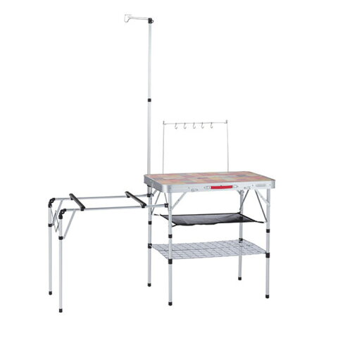 収納棚からランタンスタンドまで必要なもの全てが揃ったコンパクト収納のキッチンテーブル ■使用時サイズ:約149×55.5×170/190(h)cm (テーブル/約80×54×80(h)cm) ■収納時サイズ:約80×11×28(h)cm ■重量:約6.7kg ■材質: フレーム/アルミニウム 天板/メラミン加工合板 シェルフ/スチール ■耐荷重: テーブル/約30kg シェルフ/約25kg ■仕様:キッチンテーブル、ネット、シェルフ、ランタンポール、バーナースタンド、ツールハンガー ■付属品:収納ケース 検索ワード: アウトドア キャンプ レジャー アウトドアグッズ キャンプ用品 花見 ピクニック BBQ キッチンスタンド ファニチャー キッチン用品 コールマンキッチンスタンド コールマンキッチンテーブル 人気 オールインワン